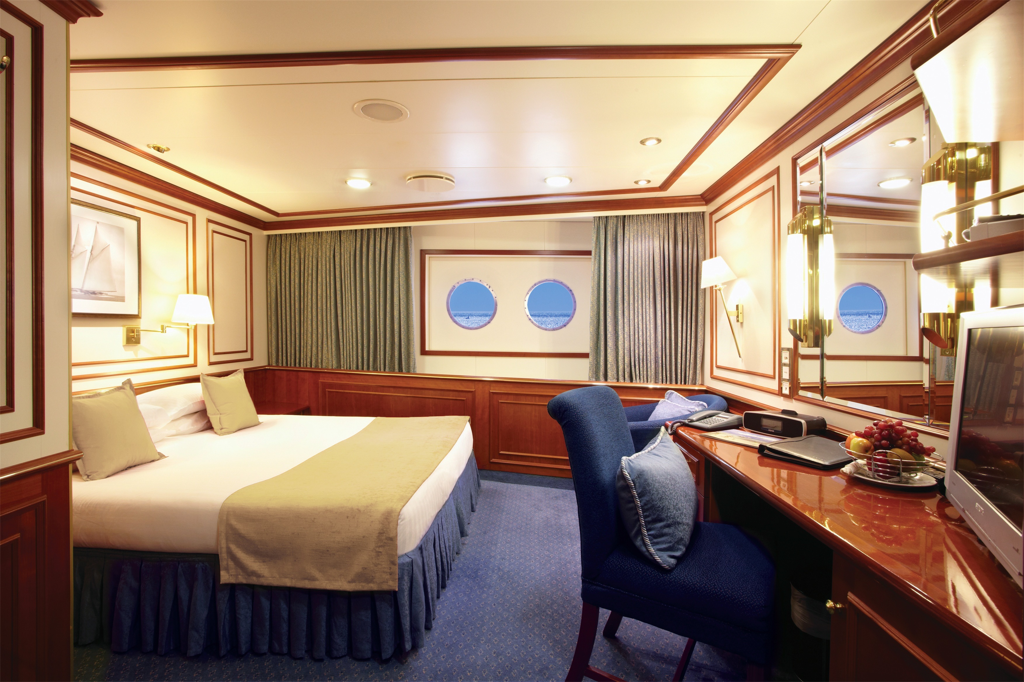 Oceanview staterooms are nicely appointed cabins and have a large oval window, a comfortable sitting area with a tub chair, and a writing desk with drawer space. All staterooms feature individual climate control, flat-panel TV, private bathroom with glass-walled shower stall, ample storage space, personal safe, hairdryer, mini refrigerator, and Ethernet jacks
