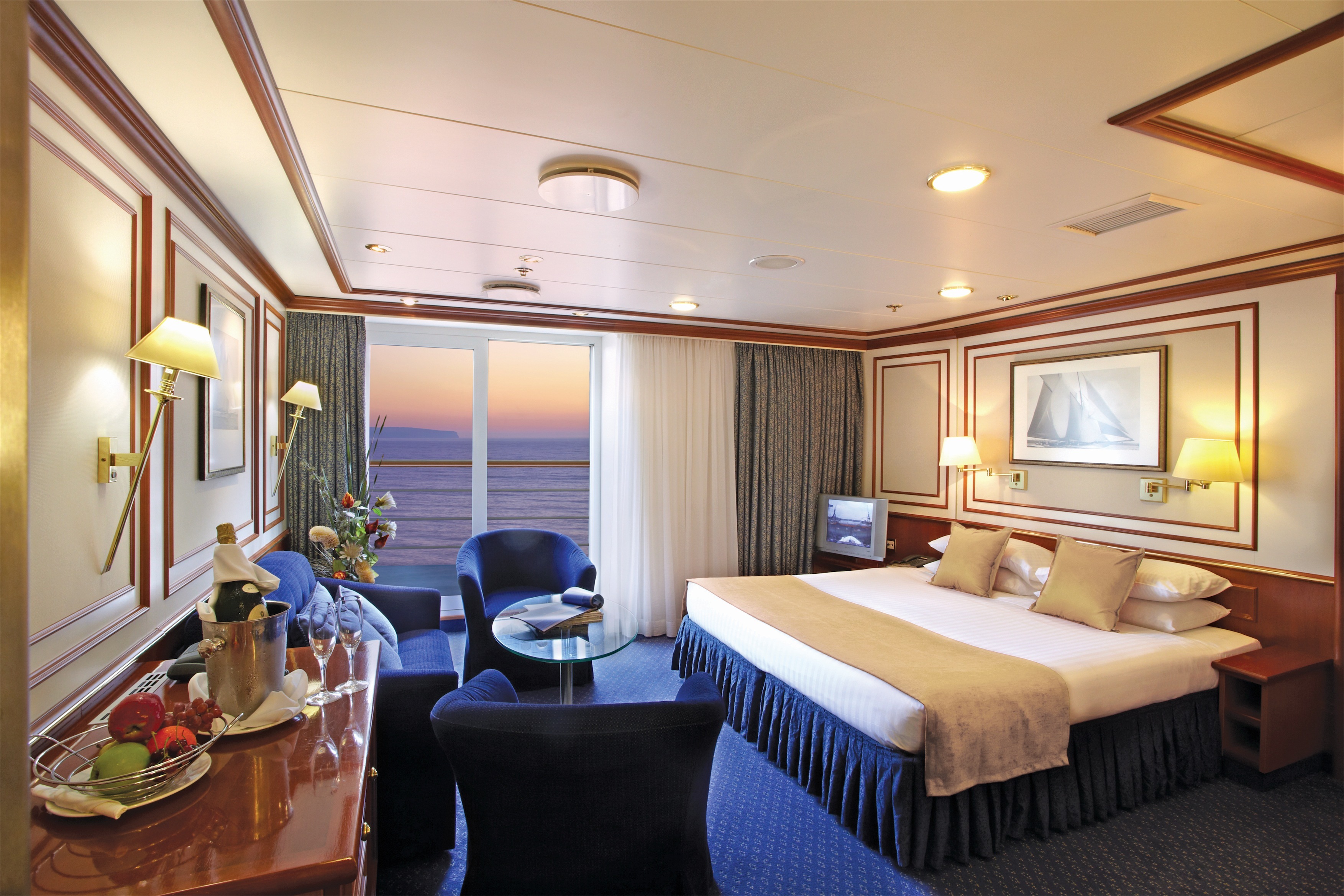 Balcony suites are spacious, with open living areas and sliding glass doors that open to a French balcony allowing you to take in the sea breeze. There is a living room-style area appointed with a couch that converts to accommodate a third person. All staterooms feature individual climate control, flat-panel TV, private bathroom with glass-walled shower stall, ample storage space, personal safe, hairdryer, mini refrigerator, and Ethernet jack.